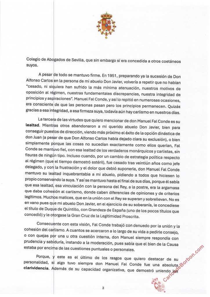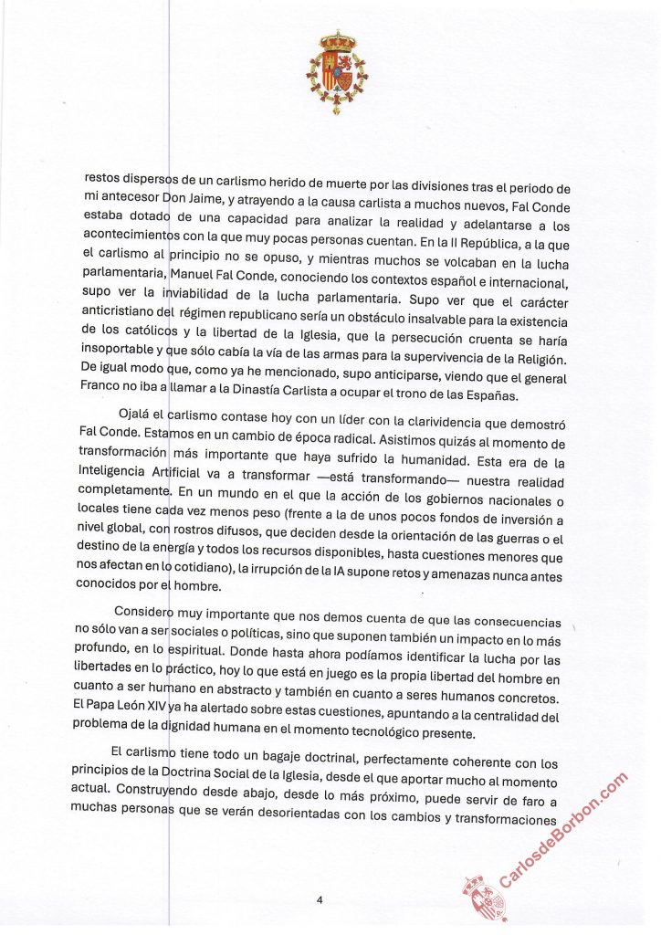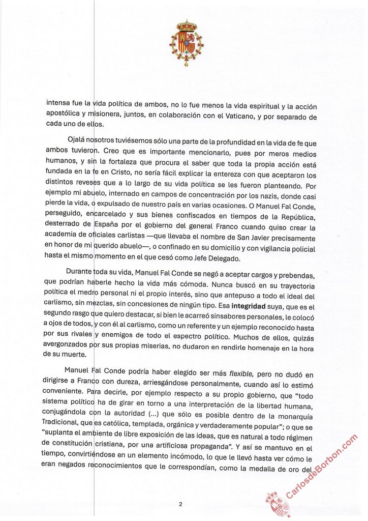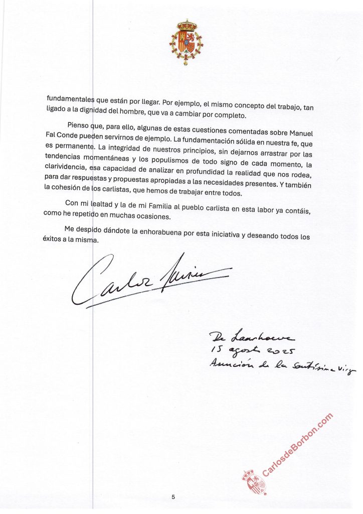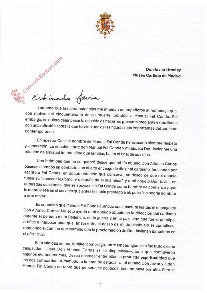 Reproducimos una copia de la comunicación que Don Carlos Javier de Borbón remitió al acto que, en homenaje a don Manuel Fal Conde, organizó el Museo Carlista de Madrid el pasado sábado, 13 de septiembre de 2025, en la localidad de El Escorial.
