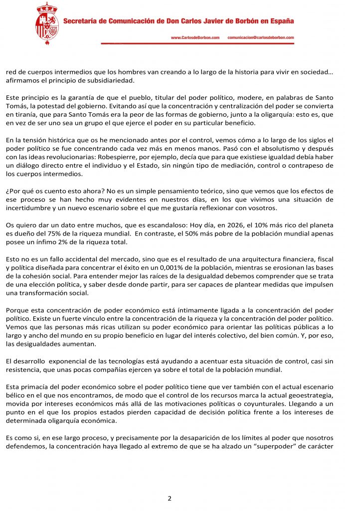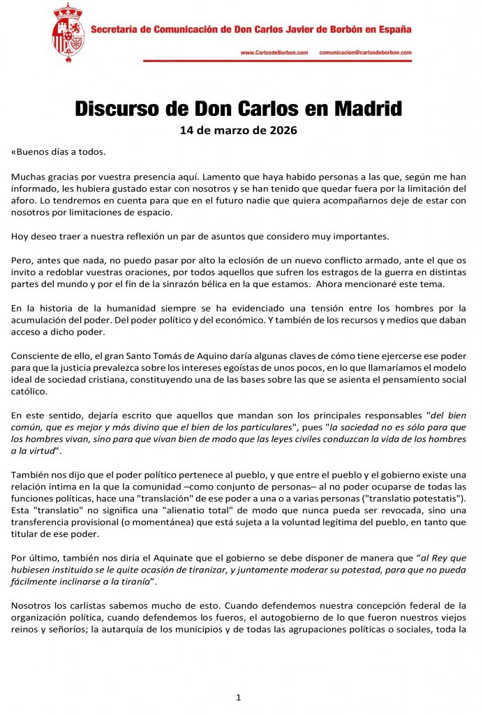 Compartimos el discurso que el Duque de Madrid pronunció en la capital española el pasado 14 de marzo de 2026, en el que reflexionó sobre la concentración del poder político, los vínculos entre éste y el poder económico, así como las limitaciones al poder desde el principio de subsidiariedad y los cuerpos sociales intermedios. También sobre la relación de estos asuntos con la acumulación de la riqueza en pocas manos y el crecimiento de las injusticias sociales.